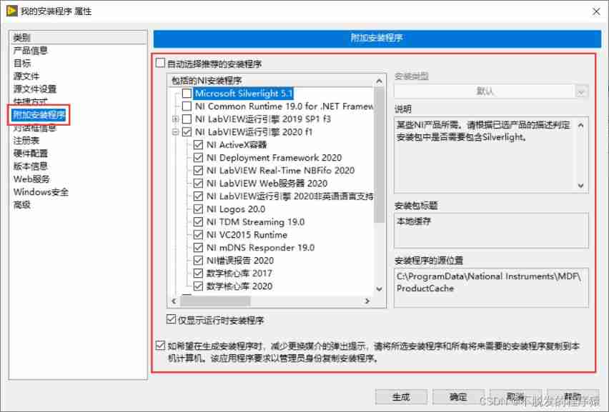 The first 5 Step : choice “ Additional installer ”, Check the appropriate LabVIEW Run the engine and necessary drivers, toolkits, etc , Then these drivers and the toolkit will be included in the generated installer in .LabVIEW Some necessary... Will be automatically checked here NI Erection sequence , But it may not contain all the programs that need to be installed , What drivers and toolkits are used in the program at this time , When configuring here, you need to check which toolkits . As shown in the figure below :