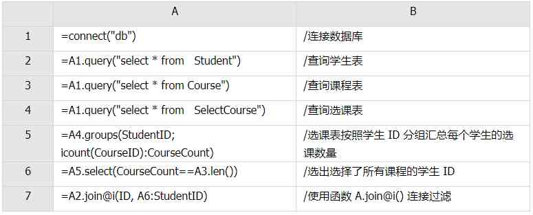 从学生表选出数据时,判断学生是否存在某一科目课程没有选出的记录,如果不存在则选出。处理双重否定的存在性检测时,我们也可以正向思考,只要选出选修科目数量与所有科目数量相同的记录即可。