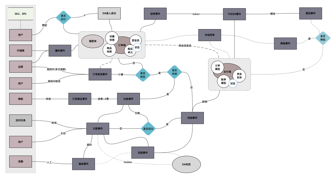 Through the above process 、 The single event was identified 、 Credit event 、 Downgrade event 、 Cancel event 、 Check out events 、 Deduction event 、 Debt event 、 Repayment event 、 Closing event 、 Collection events and order fulfillment events are dozens of domain events ;