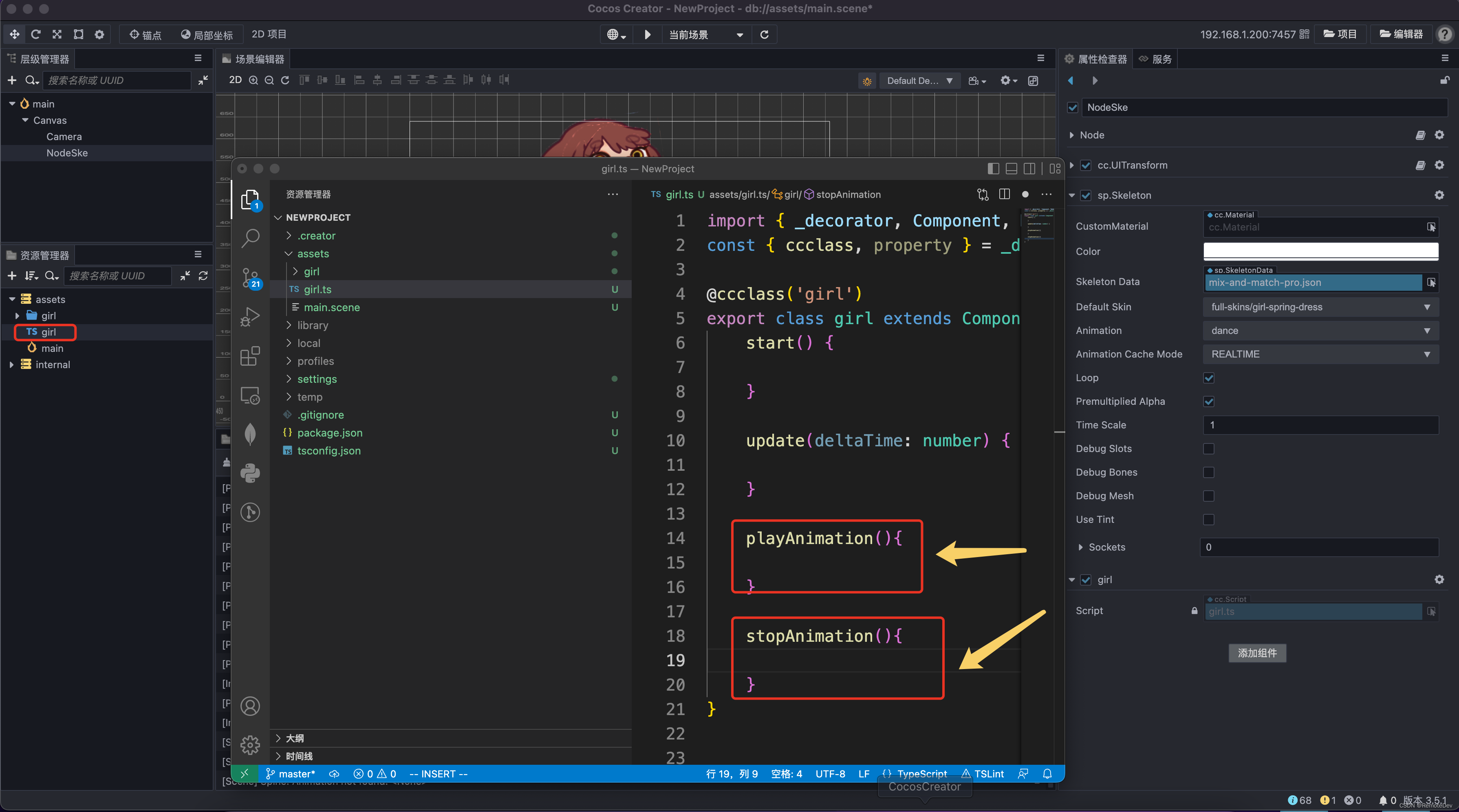 c. Double click the script to open VSCODE And in girl.ts Add methods to play animation and stop animation