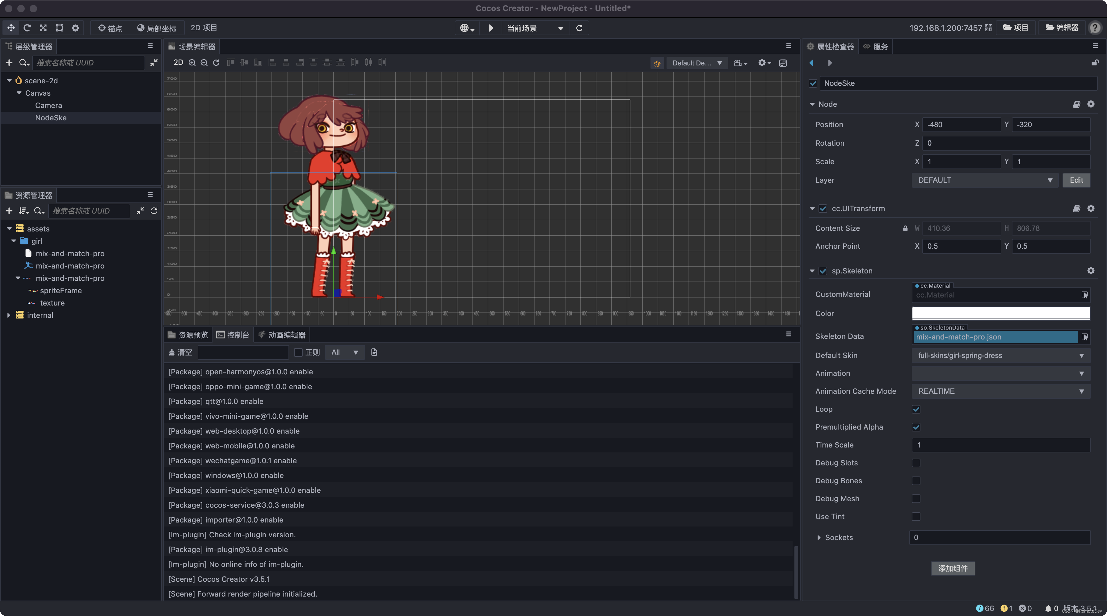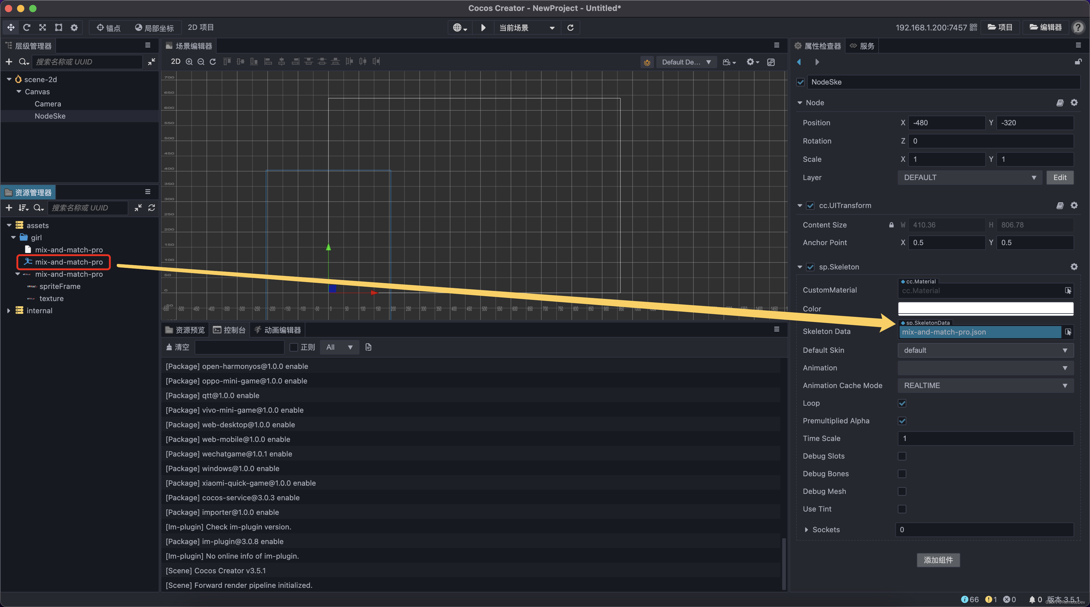 After successful addition , Click on NodeSke node , You can see that... Has been added to the property inspector sp.Skeleton node