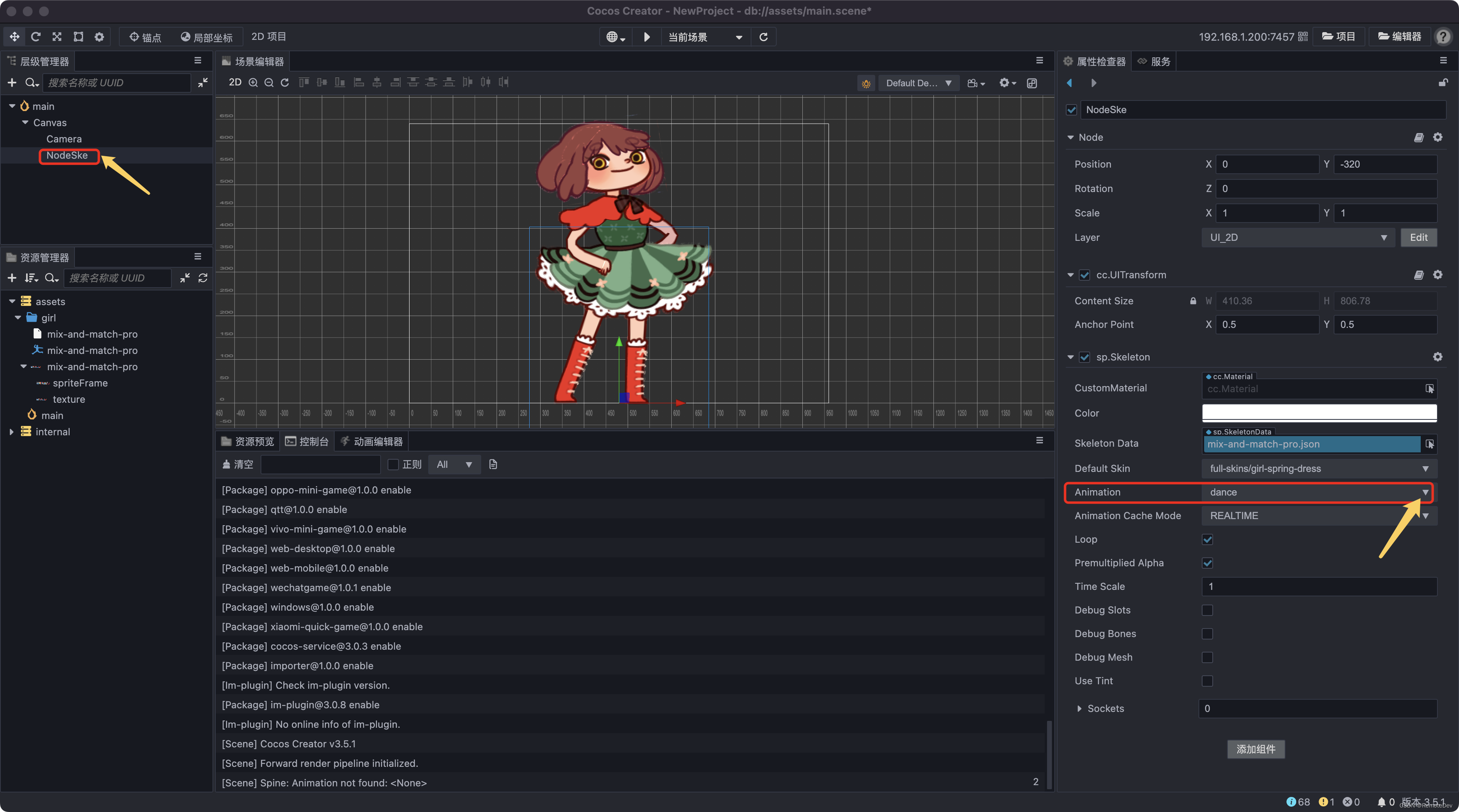 11. Select the empty node NodeSke, Then select the animation to play by default in the attribute inspector on the right