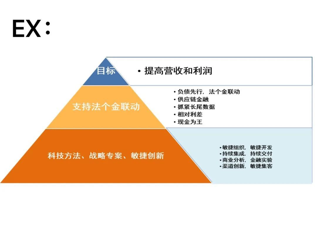 At the strategic planning level of financial digital transformation , Mainly based on scenario finance 、 User experience 、 Digital operations 、 Agile drive is the core direction , Then match with key technologies and operational objectives , Connect the asset side and capital side through a smart and open platform . Its main purpose is to empower banking , Raise the level of science and Technology , Produce innovative products , At the same time, enhance the popularity of the company .