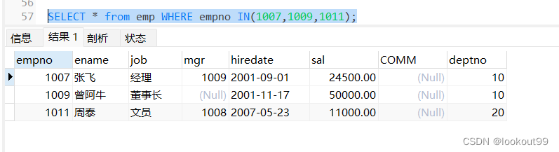 10. Use keywords in, Inquire about id The value is 1 or 5 or 7 Basic information of students