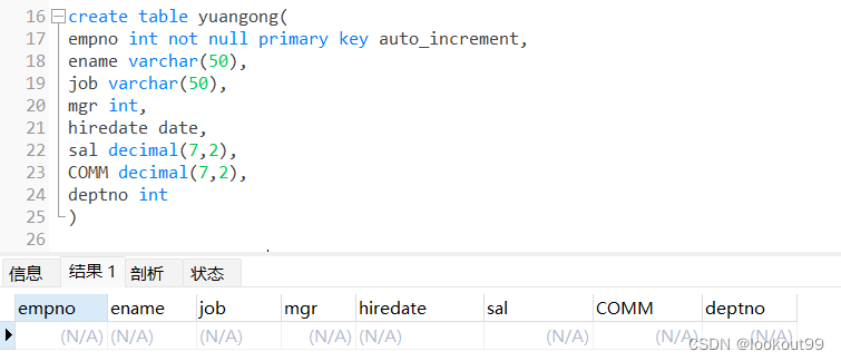 2. stay test Create in the database yuangong surface , The table structure is shown in the following figure (id Set as primary key self growth )