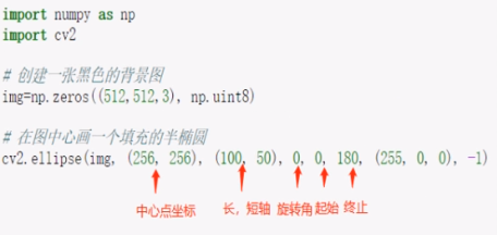 Drawing ellipses requires many parameters , Please refer to the following code to understand these parameters .