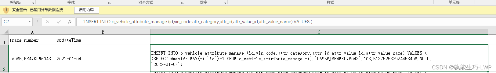 3.再用循环打印拼接sql,5000一次,分为5批生成sql语句,车架号和最近一次入库时间的属性id