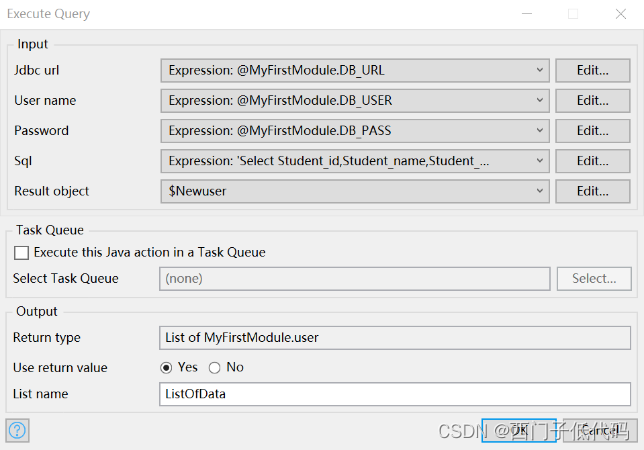 ②使用Database Connector中带的Execute Query,写入查询语句进行数据库查询