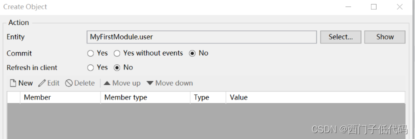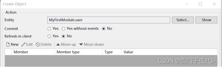 Tips:与2.4小节不同的是在“Show Message”后添加“Create object”。“Commit“选择“No”;“Refresh in client”选择“Yes”,目的是在增加和修改操作后刷新当前页面