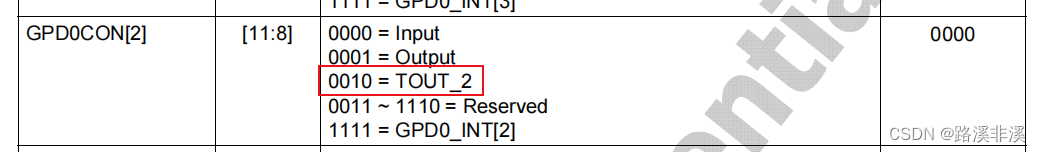 (3)GPD0CON(0xE02000A0), To put bit8~bit11 Set to 0b0010( Function selection is TOUT_2, Set this pin to PWM Output function )