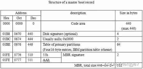 Master boot record (Master Boot Record, abbreviation :MBR), Also known as the primary boot sector , It is the first sector that must be read when accessing the hard disk after the computer is turned on , Its three-dimensional address on the hard disk is (0 cylinder ,0 head ,1 A sector ) perhaps LBA Addressing 0 Sector No . When discussing the internal structure of the primary boot sector , Sometimes it begins with 446 Byte content refers specifically to “ Master boot record ”(MBR), Followed by 4 individual 16 Bytes of “ Partition table ”(DPT), as well as 2 End of byte flag (55AA). therefore , In the use of “ Master boot record ”(MBR) When this term is used , It needs to be judged according to the specific situation that it refers to the entire primary boot sector , It is also the front of the primary boot sector 446 byte .