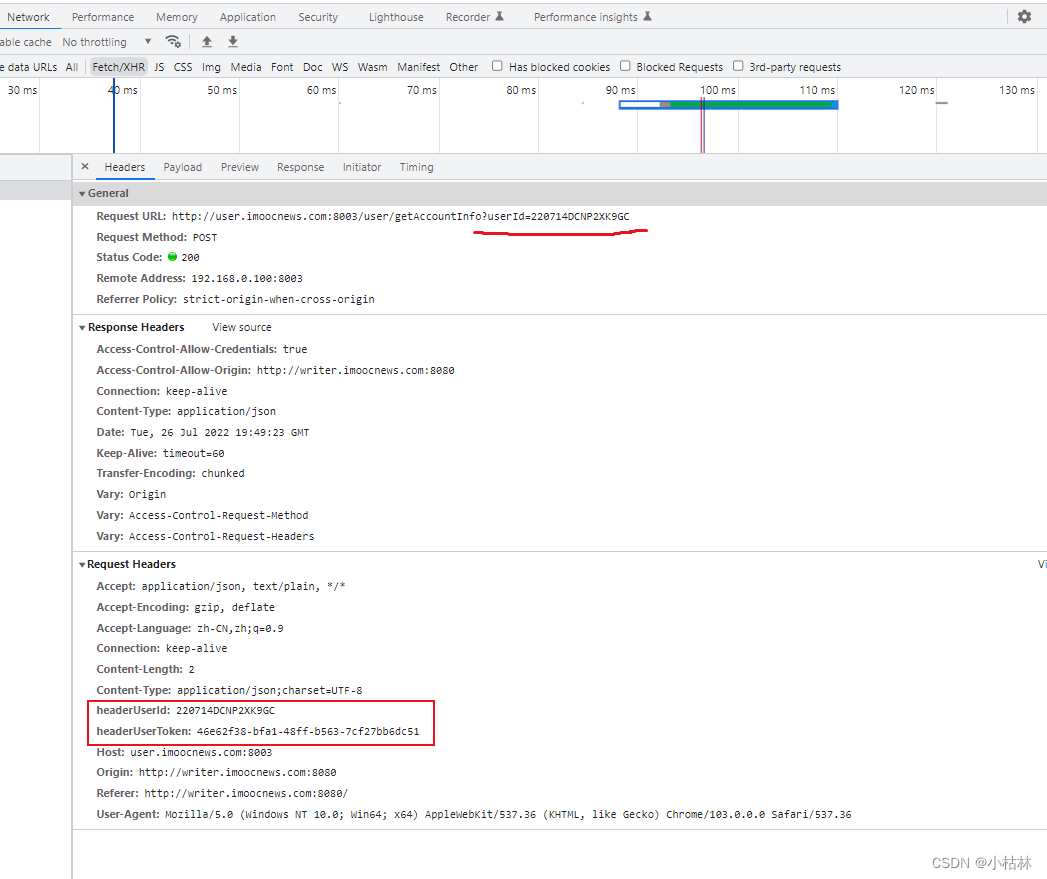 (3) then , We put uid and utoken Set to cookie In the after , Later, judge whether the user logs in 、 publish || Delete articles 、 When querying the article list and other interfaces , The front end will start from cookie In order to get uid and utoken, Set it into header Request header ; meanwhile , You see uid Set in url in ;