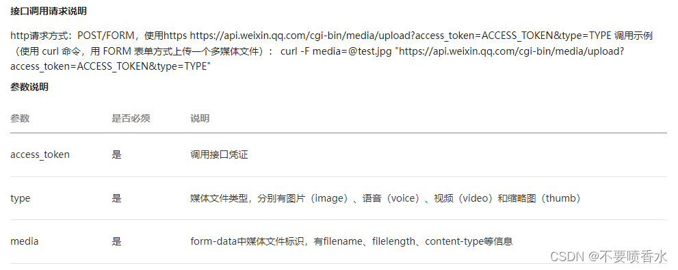 实测临时素材接口中文件参数名media可以非固定参数名,改为如file之类的参数名仍可上传成功