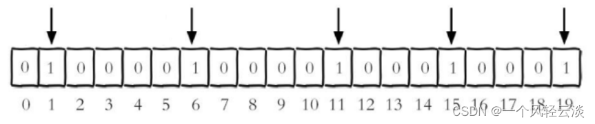 设置键的第offset个位的值(从0算起) , 假设现在有20个用户,userid=1, 6, 11, 15, 19的用户对网站进行了访问, 那么当前Bitmaps初始化结果如图