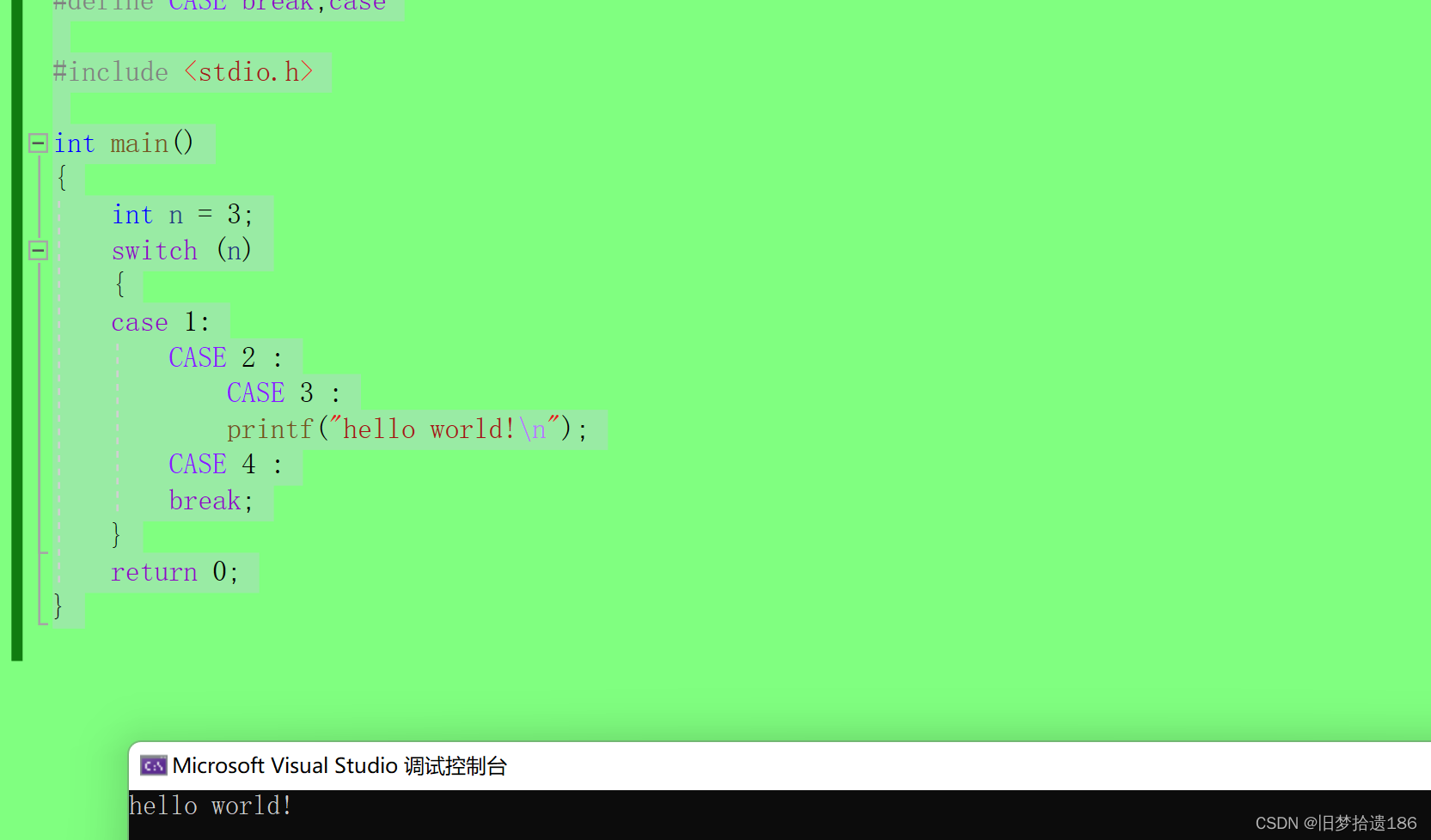 #define CASE break;case #include <stdio.h> int main() { int n = 3; switch (n) { case 1: CASE 2 : CASE 3 : printf("hello world!\n"); CASE 4 : break; } return 0; }
