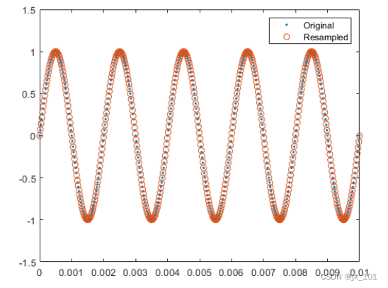 例如,使用 48 kHz 的原始采样率创建一段 10 毫秒长的 500 Hz 正弦波,并将其转换为 44.1 kHz: