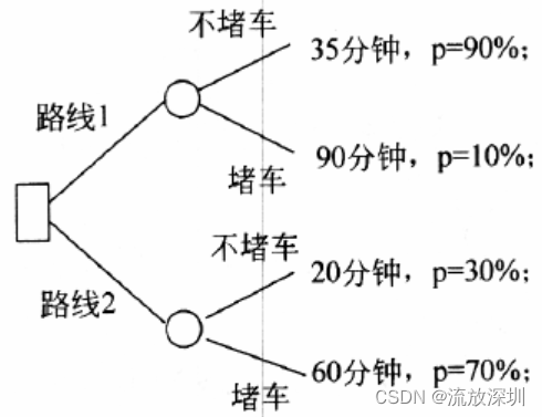 Route 1 The weighted average time of is 40.5 minute , Route 2 The weighted average time of is 48 minute , So choose a route 1.