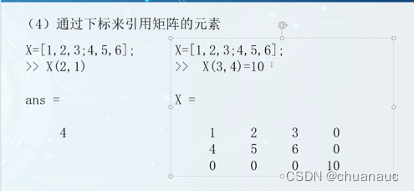 如第二个例子中,X矩阵本来是一个2行3列的矩阵,显然X(3,4)不在矩阵范围中,但是这个操作可行,结果就是除了对应(3,4)位置处结果为10,其余位置以0补充,使得矩阵成为3行4列