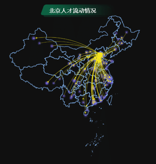 地理空间的数据,需要特定的地图图表来呈现,最常见的就是世界地图、中国地图。下图是北京市的人才流动情况,人才从全国各个地区流入,数据多而复杂,单纯的依靠Excel来呈现不仅不便于数据的理解而且很繁杂。用飞线地图可视化来呈现十分简单易懂,人才从哪个省市流入显而易见。