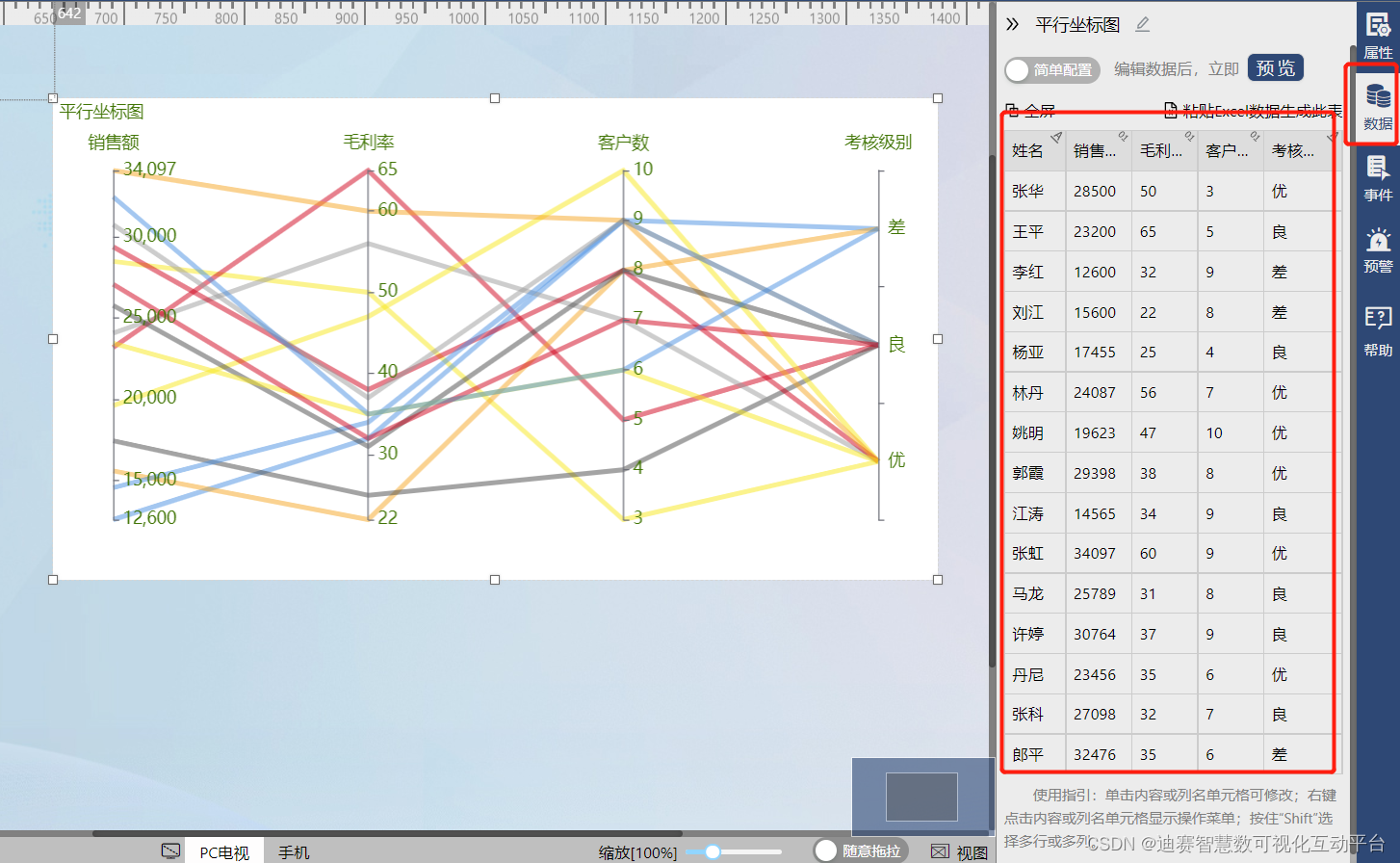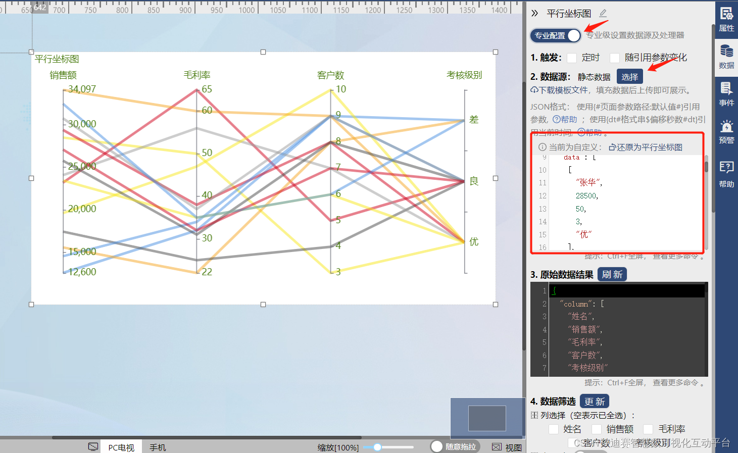 很快创建好平行坐标图,然后还需要我们对创建好的平行坐标图进行样式设置让它变得美观且符合大屏的显示,以及对数据进行设置。