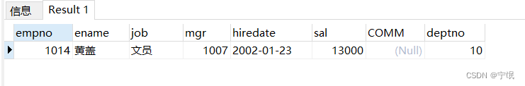 (1014,"黄盖","文员",1007,"2002-01-23",13000.00,null,10),