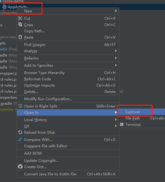 adopt android studio Use in windows Explorer opens AppActivty.java You can find AppActivity.java be located 「native」/engine/android/app/src/com/cocos/game Directory