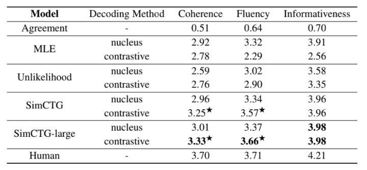 surface 3 It shows the manual evaluation results generated by the open domain dialog ,“SimCTG+ Compare search ” It is obviously superior to other methods in various indicators , It shows that it can be extended to different languages and tasks . stay LCCC In benchmarking ,“SimCTG+ Compare search ” Performs well in terms of consistency and amount of information , Especially in terms of fluency , Even beyond the human benchmark !