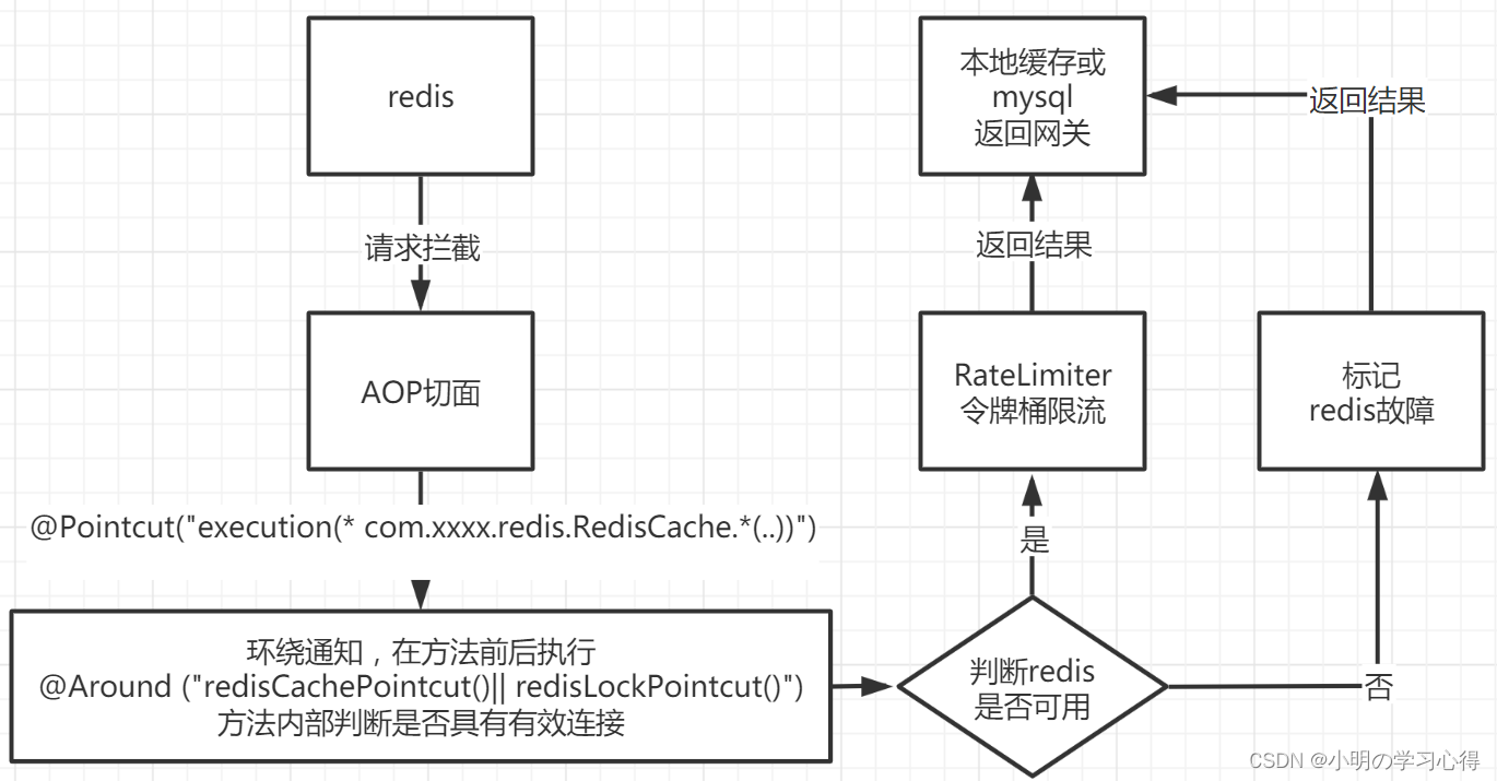 system operation redis In general, all the methods of RedisCache and Redislock Two classes to handle , So we went through AOP Cut the way , Make an aspect of all the methods in these two classes , If you execute here redis During operation ,redis Hang up , Connection failed , Then the method will throw exceptions , We are on the method of section processing , The catching , Then record it as redis Hang up is still a temporary fluctuation of the network