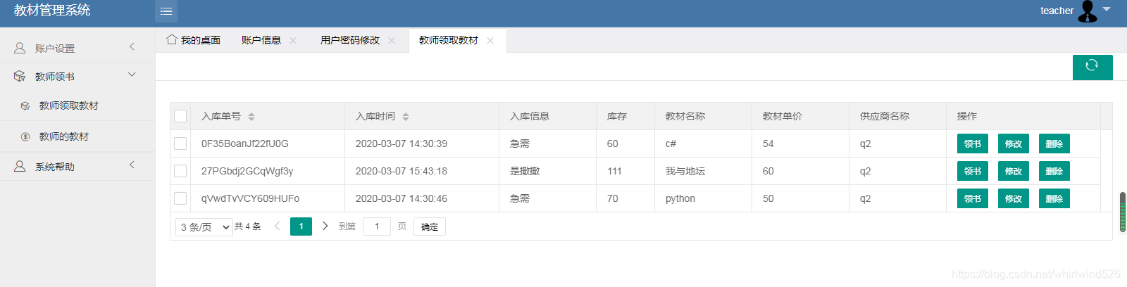 学生只能在对应的教师那里领取教材,并且可以退还教材、查询自己已经领取的教材。并且对已领教材付款。