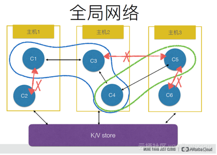 Global network means , Containers in a network can span hosts .C1 The container can be connected with the host 2 Upper C3 Containers , Through them IP Direct communication , It doesn't matter where the host is . We can also see a detail in this figure , The same container can be added to two networks , such as C4 It can be connected with the network 1 The two containers inside communicate , You can also connect with the network 2 Inside C5 communicate , In this way, we can realize some more complex combinations . such as C5 It is a container of database , I don't want this data to be used by the previous WEB Applications or other applications to access , I just want my middle key application to access . In this way, you can add the middle key application to a background network 、 A combination of foreground networks to realize this interconnection and network control .