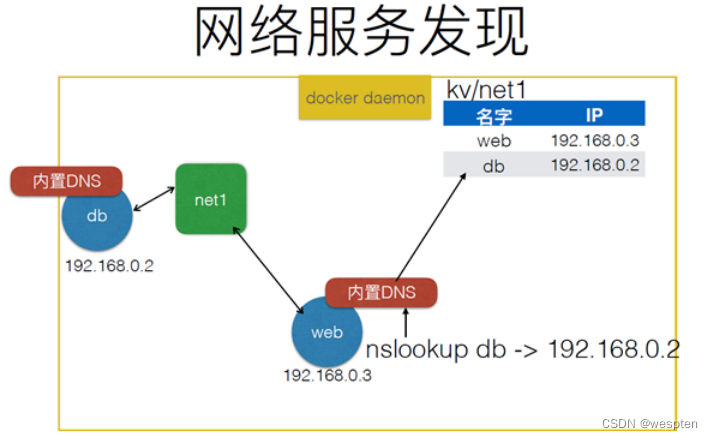 stay 1.10 Web service discovery has been added in version , What does that mean ? such as , One of my networks has two containers , We can go straight through IP communicate , But my container may have knelt down for some time , It may restart after kneeling down , I don't know its IP 了 , Or as soon as it closes , I can't feel it on my side , This will trigger many complex processing processes . stay 1.10 When it does such a thing , It has a built-in DNS Server for , On the server RUN Up to then , Will write a container name , Or an alias of this container and it IP An analysis of . External container to access my DB When the container , It can go through DB This name resolves to DB Container of IP Address , In this way DB After the container restarts , This analysis will be dynamically adjusted , You can realize the discovery of a service .