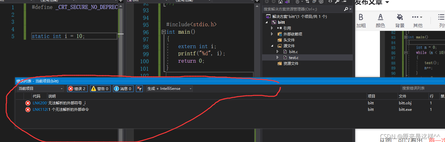 图一可以看出用全局变量在整个工程的其他文件内部能被使用,是因为全局变量具有外部链接属性图二可以看到经过static修饰后,全局变量只能在源文件使用,其它文件不能使用,给我们的感觉相当于作用域变小了