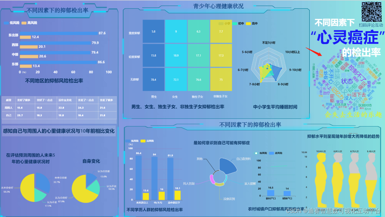 stay 【 Adolescent mental health status 】 In the big data screen , It can be seen intuitively that “ Psychic cancer ” The biggest reason is “ Have no meaning ”、“ life ”、“ depressed ” and “ Uncomfortable ” Wait for negative emotions .