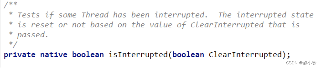 public boolean isInterrupted() | 实例方法, 判断当前线程是否被中断(通过检查中断标志位) |