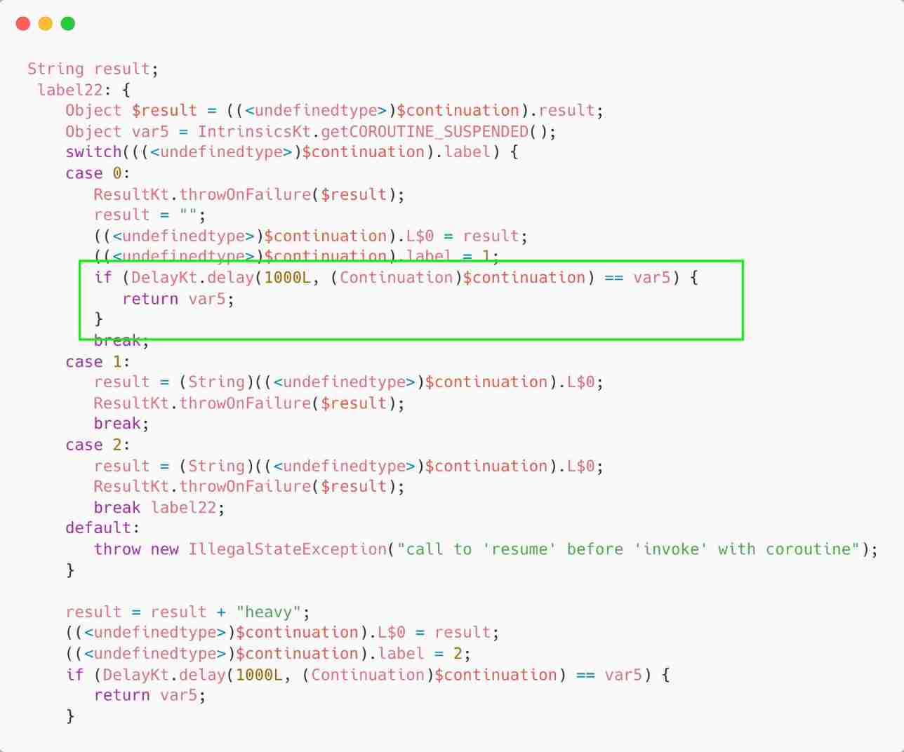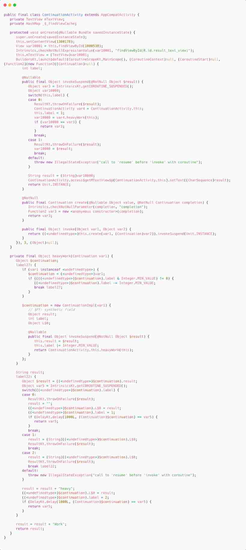 call heavyWork(this) Into this object . As we can see from the above ,heavyWork After decompiling, the method becomes heavyWork(Continuation var). It means that Function2 yes Continuation type .