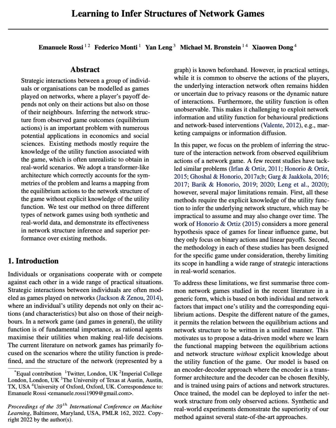 网络博弈结构推断学习。一组个人或组织之间的战略互动可以被模拟为在网络上进行的博弈,其中参与者的回报不仅取决于他们的行动,也取决于他们邻居的行动。从观察到的博弈结果(均衡行动)来推断网络结构是一个重要的问题,在经济学和社会科学中有许多潜在的应用。现有的方法大多需要了解与博弈相关的效用函数,这在现实世界的场景中往往是不现实的。本文采用一种类似于Transformer的结构,正确地解释了问题的对称性,并在不明确知道效用函数的情况下学习了从均衡行动到博弈网络结构的映射。在三种不同类型的网络博弈上使用合成和真实世界的数据测试了所提出的方法,证明了它在网络结构推断中的有效性和比现有方法更优越的性能。