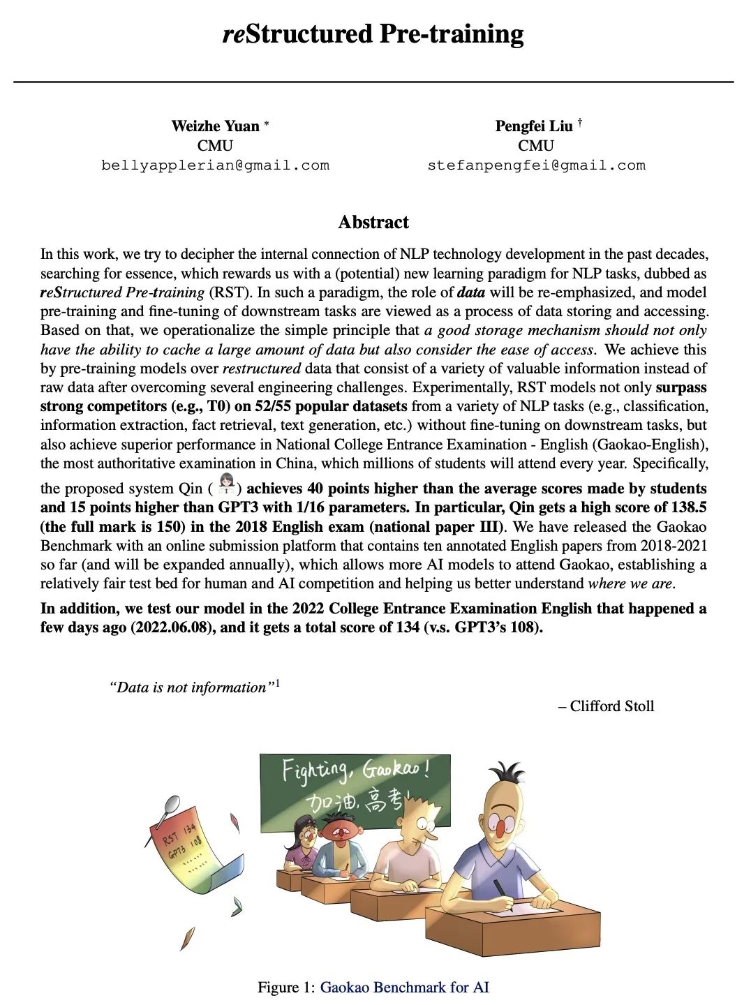 重构式预训练。本文试图破解过去几十年NLP技术发展的内部联系,寻找其本质,从而为NLP任务提供一种(潜在的)新的学习范式,称为重构式预训练(RST)。在这种范式中,数据的作用将被重新强调,模型的预训练和下游任务的微调被看作是一个数据存储和访问的过程。在此基础上,将一个简单的原则操作化,即一个好的存储机制不仅要有缓存大量数据的能力,还要考虑访问的便捷性。在克服了一些工程上的挑战后,本文通过对由各种有价值的信息组成的重组数据而不是原始数据进行预训练来实现这一目标。通过实验,RST模型不仅在各种NLP任务(如分类、信息抽取、事实检索、文本生成等)的52/55个流行数据集上超越了强大的竞争对手(如T0),而且在全国高考英语(Gaokao-English)中取得了优异的成绩。具体来说,所提出的系统Qin取得了比学生所做的平均分数高40分,用1/16的参数取得了比GPT3高15分的成绩。特别是,Qin在2018年英语考试(全国卷III)中获得了138.5的高分(满分150分)。通过在线提交平台发布了高考基准,其中包含了2018-2021年的十份有标注的英语试卷,到目前为止(并将每年扩展),这使得更多AI模型可以参加高考,为人类和AI竞争建立一个相对公平的测试平台,帮助我们更好地了解所处的位置。我们在最近(2022.06.08)的2022年高考英语中测试所提出模型,得到的总分是134分(GPT3得分为108分)。