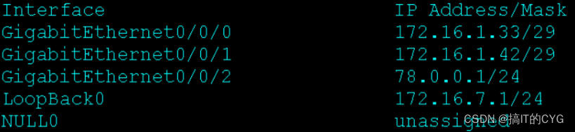 [r7-GigabitEthernet0/0/0]ip a 172.16.1.42 29