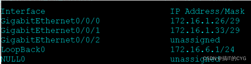 [r6-GigabitEthernet0/0/0]ip a 172.16.1.34 29
