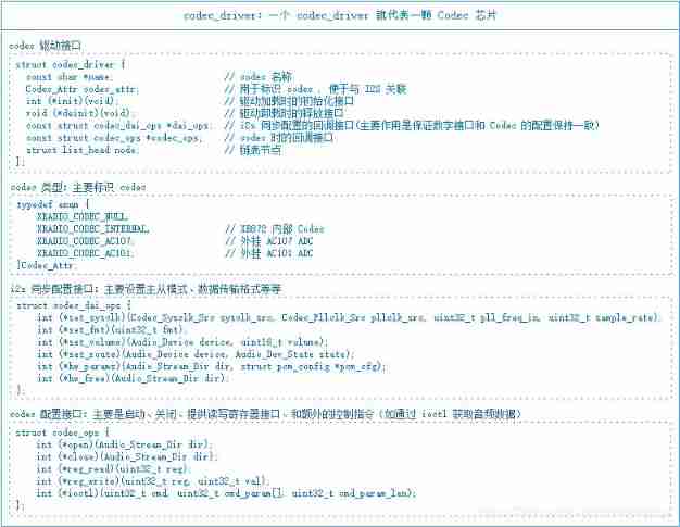It is related to the concrete Codec Chip related drivers , The main interaction objects are AC107 , Play the role of configuration AC107 The function of the relevant register , The specific configuration will be the same as platfrom_driver Association synchronization , Such as configuration I2S Master-slave relationship , Data transfer format , clock frequency , start-up 、 Stop data collection . One codec_driver It means one Codec chip .