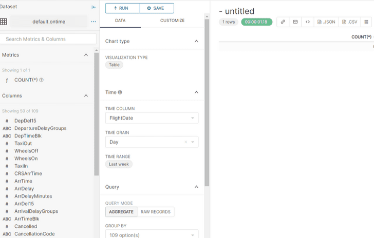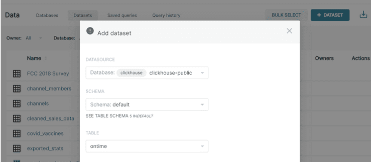 First , Let's create a dataset . choice clickhouse-public As the connection , And then choose schema default and table ontime.