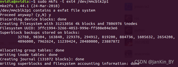 执行sudo mkfs -t ext4 /dev/mmcblk2p1,将sd卡格式化为ext4模式。