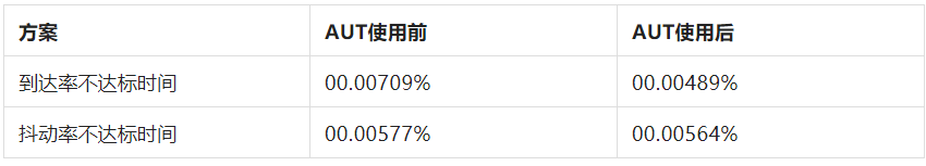 由于之前的 RTC 网内传输质量已经十分优秀,在到达率和抖动相关指标都已经做到 4 个 9 的达标前提下,引入 AUT 后进一步降低不达标时间,使得 SD-RTN 的质量向专线进一步看齐。