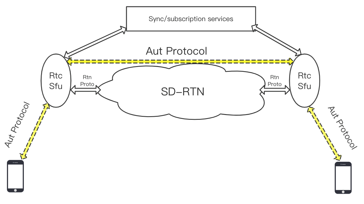 AUT 在声网 RTC 业务中的整体所在位置如下图所示,可以看到,在用户接入声网边缘节点的 Lastmile,和声网边缘节点之间基于 SD-RTNTM 的网内传输,都使用 AUT 作为 4 层传输协议。