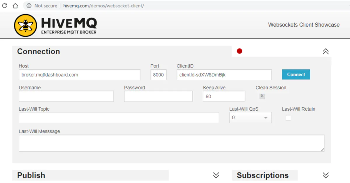 至于MQTT broker,我选择了一个基于HiveMQ的公开Broker:broker.mqttdashboard.com,可以使用下面这个用webSocket实现的MQTT客户端来操作该broker.