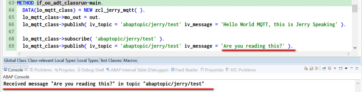接着我首先在第66行,往该渠道发送一条Hello World的消息,broker收到后会将其原封不动地返回,但因为我的ABAP类并没有订阅这个渠道,因此不会收到这条hello world消息的回复。