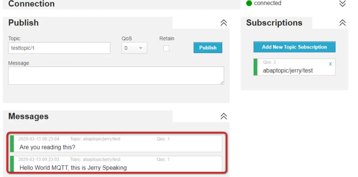 打开MQTT客户端,订阅渠道:abaptopic/jerry/test