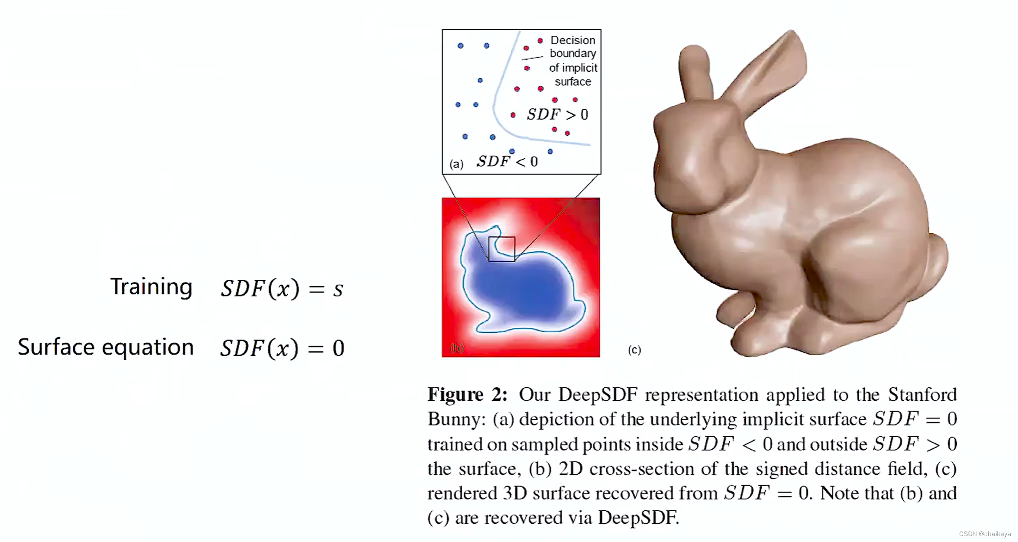启发2:【Deep SDF】预测一个物体的3D物体的表面得到他的一个几何结构。也是一个隐式的方法,需要去找到表面的一个位置,但是很难直接去预测表面的各个点,所以把它变成预测一个signed distance function(符号距离函数),输入x是3D空间的三维坐标,输出的s是各个点到物体表面的距离(外面SDF>0,里面的SDF<0),通过采样的方法来训练得到一个SDF。