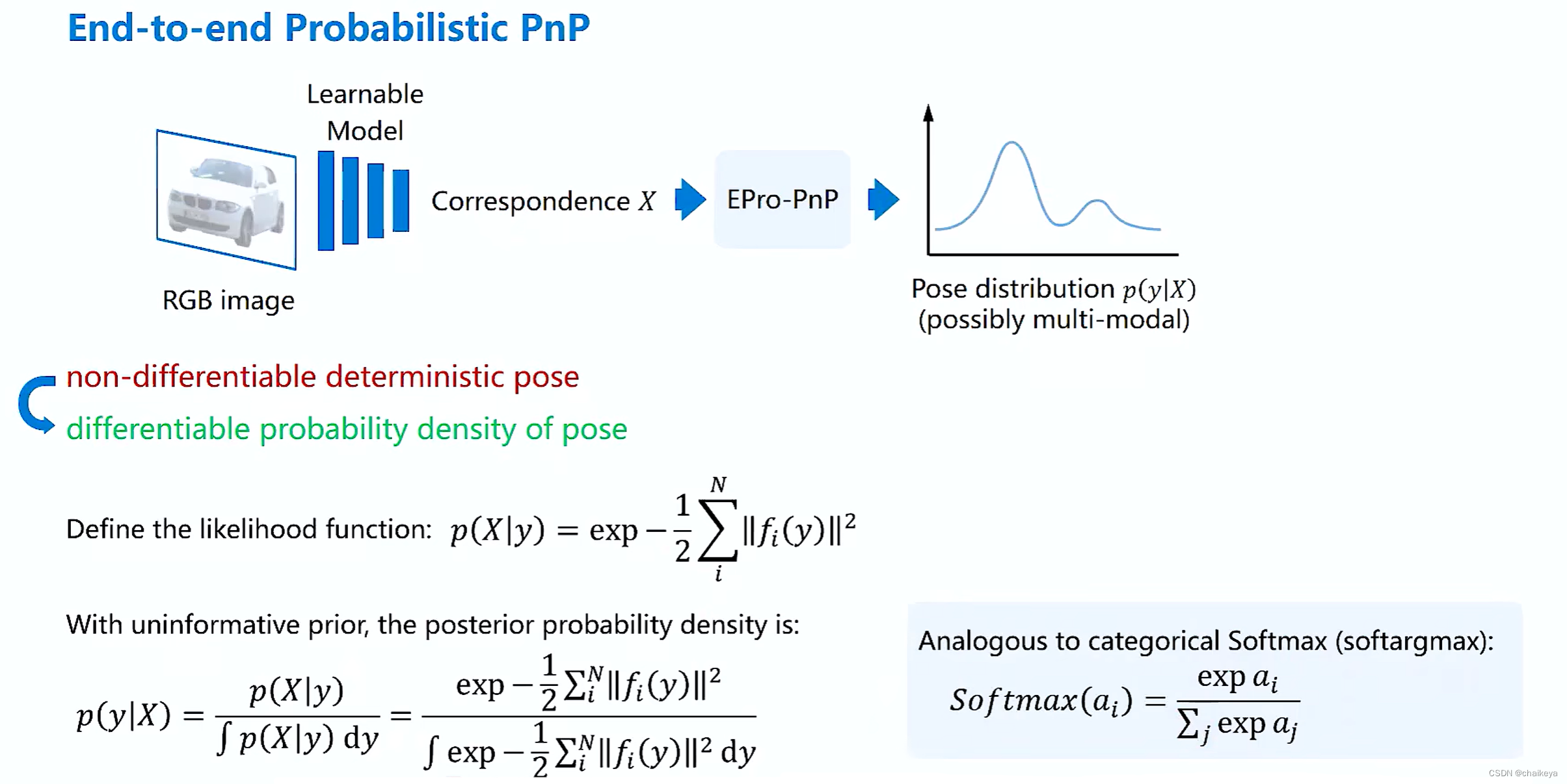 本文试图把不可微分的—个最优解deterministic pose固定的一个单独位姿把它变成一个可微的东西。用了概率框架,把PnP视角转换一下,输出一个关于位姿的概率分布。输入Correspondence X是一个可导的东西,通过经典的贝叶斯公式推导得到一个概率密度。